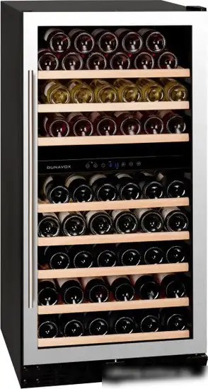 Винный шкаф Dunavox DX-94.270SDSK предназначен для хранения до 94 бутылок в нержавеющей стали корпуса. Он встраивается в кухню и имеет две зоны для разных температур — от 5 до 22 °C, что позволяет оптимально хранить разные виды вина. Электронное управление внутри шкафа позволяет легко регулировать температуру и следить за её реальностью на дисплее. Стеклопакет двери обеспечивает надежную защиту от ультрафиолета, а вентилятор равномерно распределяет холод внутри. Внутри расположены 8 деревянных полок — удобно для организации бутылок. Шкаф оснащен сигналом открытой двери и блокировкой от детей для безопасности. Объем холодильной камеры составляет 270 литров, при этом уровень потребления электроэнергии всего 314 кВт·ч в год. Устройство обладает современным дизайном и простым управлением, что делает его удобным для дома или ресторана.
