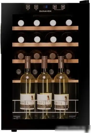 Винный шкаф Dunavox DXFH-20.62 отлично подходит для хранения до 20 бутылок. Он имеет одну температуру зону и регулирует температуру от 4 до 18°C, чтобы сохранить вино в идеальных условиях. Управление происходит через электронный блок снаружи, что облегчает настройку и показывает текущую температуру. Шкаф работает тихо, уровень шума не превышает 44 дБ. Внутри расположены 5 полок из дерева, которые помогают аккуратно и удобно хранить бутылки. Стеклопакет двери защищает содержимое, а вентилятор отсутствует, чтобы снизить уровень шума. Шкаф имеет энергоэффективность 135 кВт·ч в год и компактные размеры — шириной 43 см, глубиной 48 см и высотой 65 см. Он легко вписывается в любой интерьер благодаря современному внешнему виду и черному цвету.