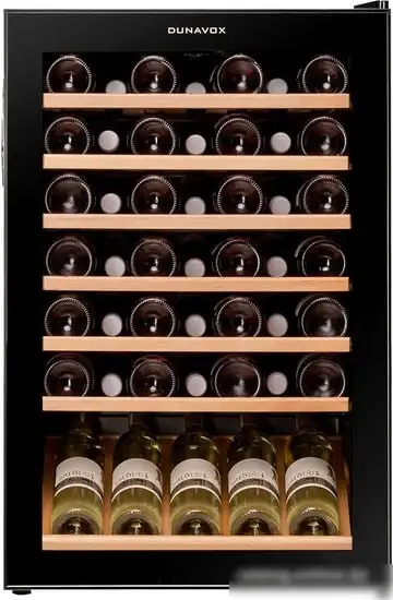 Винный шкаф Dunavox DXFH-48.130 — это удобное устройство для хранения 48 бутылок вина. Он выполнен в черном цвете и оснащен одной температурной зоной, которая регулируется в диапазоне от 5 до 18°C для оптимального хранения напитков. Шкаф работает на компрессорной технологии, что обеспечивает стабильную температуру и тихую работу с уровнем шума всего 39 дБ. Внутри расположено семь деревянных полок, которые легко регулируются для размещения бутылок разного размера. Блок управления находится внутри, его легко регулировать, а наличие вентилятора помогает равномерно распределять холод по камере. Объем холодильной камеры составляет 130 литров, а годовой расход электроэнергии — 160 кВт·ч, что делает устройство энергоэффективным. Стеклопакет двери помогает сохранять оптимальный климат внутри шкафа, а металлический вентилятор обеспечивает стабильную циркуляцию воздуха. Размеры устройства 48x48x82 см позволяют легко разместить шкаф в любой комнате.