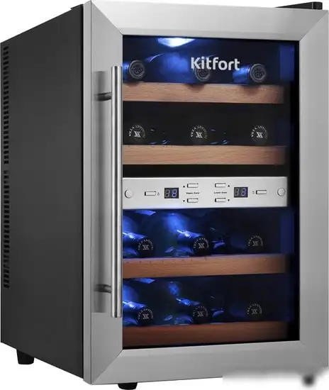 Винный шкаф Kitfort KT-2404 — это устройство, предназначенное для хранения до 12 бутылок вина. Он работает на термоэлектрической технологии охлаждения, что делает его тихим и энергоэффективным, с уровнем шума всего 41 дБ. В шкафу есть две температурные зоны, которые позволяют поддерживать оптимальные условия для разных видов вина. Электронное управление и возможность регулировки температуры от 7 до 18°C помогают поддерживать нужную температуру. Внутри шкаф оснащён 8 полками из дерева и стеклянной дверью, которая хорошо сохраняет климат внутри. Компактный и лёгкий, его легко разместить в доме или ресторане. Он отлично справляется с задачей сохранения вкуса и аромата ваших вин, обеспечивая их надежное хранение.