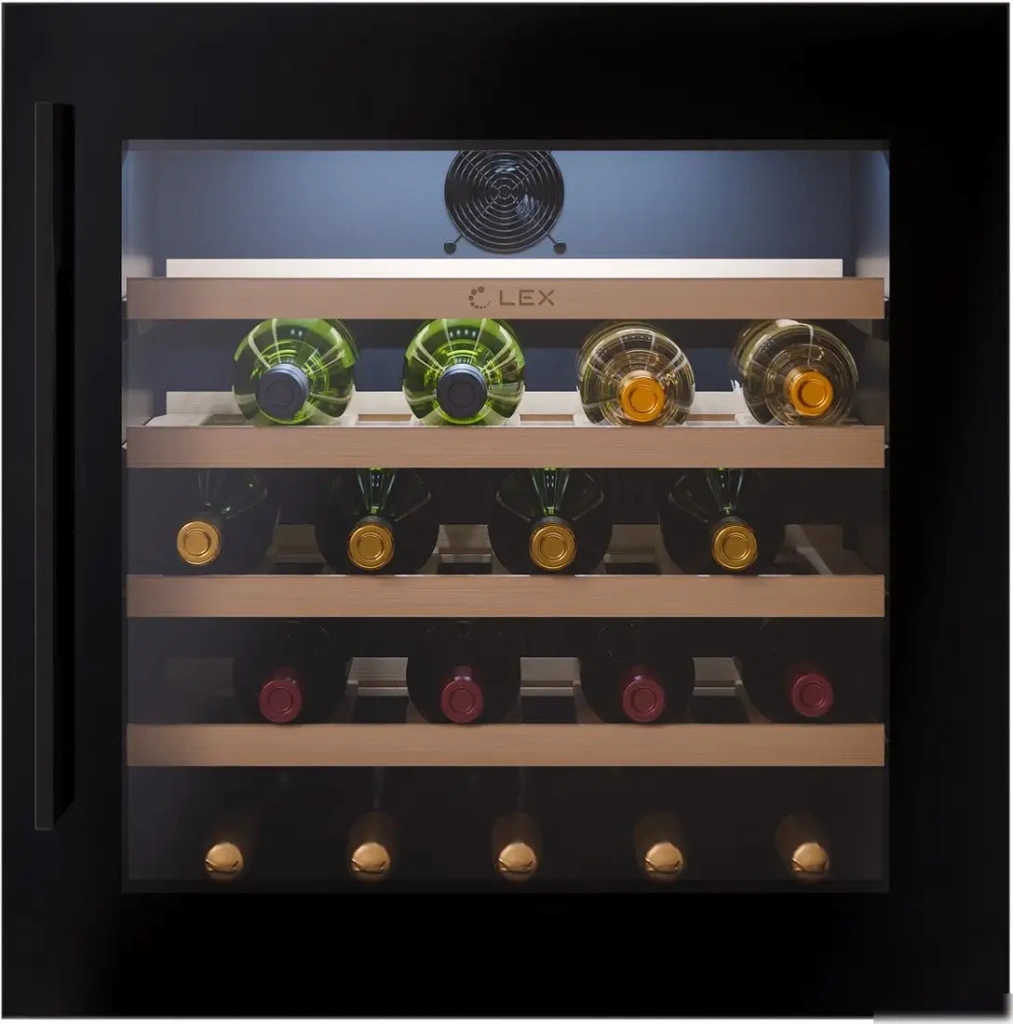 Винный шкаф LEX LWD6036BL — это встраиваемое устройство с одним температурным режимом, которое обеспечивает оптимальные условия хранения до 36 бутылок. Он оснащён компрессорной системой охлаждения, которая быстро и равномерно поддерживает нужную температуру в диапазоне 5-20°C. Управлять шкафом удобно через сенсорное управление с внутренней индикацией температуры. Пять полок из дерева позволяют компактно расположить вина, а стеклянная дверь с двойным стеклопакетом сохранит свежесть напитков и защитит их от внешних воздействий. Вентилятор обеспечивает равномерное охлаждение без шума — уровень всего 38 дБ. Благодаря замку для защиты детей и перенавешиваемым дверям, шкаф легко интегрировать в кухню или барную зону. Экономичный по расходу энергии — около 139 кВт·ч в год, он работает тихо и надёжно. Размеры идеально подходят для встроенного монтажа: ширина 59 см, высота 59.5 см и глубина 56.3 см. Этот винный шкаф станет хорошим помощником для любителей вин, обеспечивая правильные условия хранения и удобство использования.