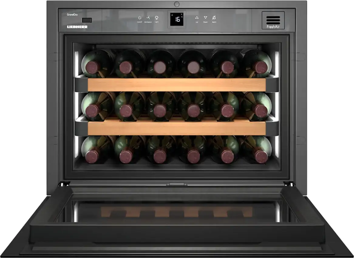 Винный шкаф Liebherr WKEgb 582 встроенного типа предназначен для хранения до 18 бутылок, он оснащён одной температурной зоной и управляется с помощью электронного блока внутри. Шкаф имеет встроенный дисплей, который показывает текущую температуру, и позволяет её регулировать в диапазоне от 5 до 20 °C. Благодаря вентилятору равномерно распределяет холод по всему объему, что обеспечивает стабильные условия для хранения. Его объём холодильной камеры составляет 46 литров, а полки сделаны из дерева, что помогает бережно обращаться с ценными напитками. Устройство оснащено антибактериальным фильтром для поддержания чистоты и встроенной системой сигнализации при открытии двери или неисправностях. Кнопка блокировки от детей помогает защитить настройки. Энергопотребление — 106 кВт-ч в год, его легко разместить как в кухонном шкафу, так и отдельно. В модели есть стеклопакет на двери, который сохраняет оптимальные условия внутри, а также аккуратный черный цвет делает её эстетичным дополнением интерьера.