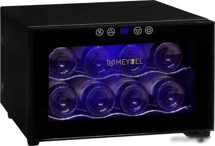 Винный шкаф Meyvel MV08-BF1 (easy) — это компактное устройство, предназначенное для хранения до 8 бутылок вина. Он оснащён одной температурной зоной и электронным управлением, что облегчает настройку режима от 7 до 18 °C. Благодаря термоэлектрической технологии охлаждения, шкаф работает тихо с уровнем шума всего 30 дБ. Полки выполнены из металла и легко переносятся, а стеклопакет двери защищает содержимое и создает привлекательный внешний вид. В устройстве есть вентилятор, который равномерно распределяет холод по всей внутренней камере. Расположение блока управления находится снаружи, что делает регулировку удобной. Полезный объём камеры составляет 23 литра, а энергоэффективность — 145 кВт·ч в год. Шкаф удобно разместить в любой комнате благодаря компактным размерам: шириной 41 см, глубиной 51,5 см и высотой 27,5 см. Он отлично сохраняет необходимый уровень влажности и температуру, чтобы вино оставалось в idealных условиях.