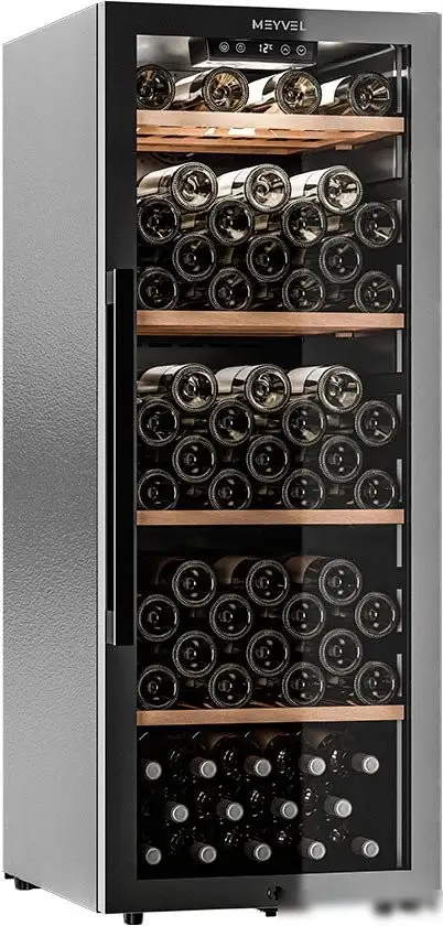 Винный шкаф Meyvel MV105-KBF1 — это отдельно стоящее устройство с одной температурной зоной, которое сохраняет вино в комфортных условиях. Он охлаждает напитки с помощью компрессорной технологии, обладает вместимостью до 105 бутылок и имеет пять полок из дерева для аккуратного хранения. Управление осуществляется сенсорной панелью внутри шкафа, которая позволяет легко регулировать температуру в диапазоне от 5 до 20°C и отслеживать её на дисплее. Встроенный антибактериальный фильтр помогает поддерживать чистоту внутри камеры. Шкаф работает тихо, уровень шума составляет всего 38 дБ, что не мешает тишине в доме или офисе. Конструкция включает стеклопакет на двери и цепляющиеся двери — переносить её нельзя. Он имеет энергоэффективный класс A и ежегодной расход электроэнергии около 147 кВт·ч. Маленький, компактный и легкий — его размеры: ширина 49 см, глубина 57,5 см и высота 127 см. Встроенная система индикации и сигнал о неисправностях помогают следить за состоянием шкафа.