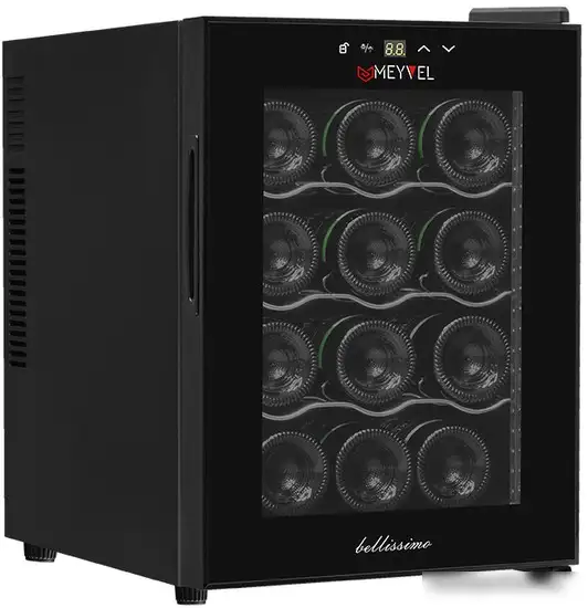 Этот винный шкаф Meyvel MV12-TB1 отлично подходит для хранения до 12 бутылок. Он имеет одну температуруную зону и управляется электронным блоком снаружи для удобства. Черный цвет корпуса и стеклопакетная дверь придают стильный вид. Вентилятор равномерно распределяет холод и поддерживает оптимальные условия. Полки из металла внутри легко регулируются для размещения бутылок разного размера. Уровень шума всего 38 дБ позволяет использовать шкаф в любой комнате без дискомфорта. Он автоматически блокируется от детей для дополнительной безопасности. Вместимость холодильной камеры составляет 33 литра, а уровень потребления электроэнергии — 135 кВт·ч в год. Температуру можно регулировать в диапазоне 10–18 °C, что обеспечивает правильные условия для хранения вина.