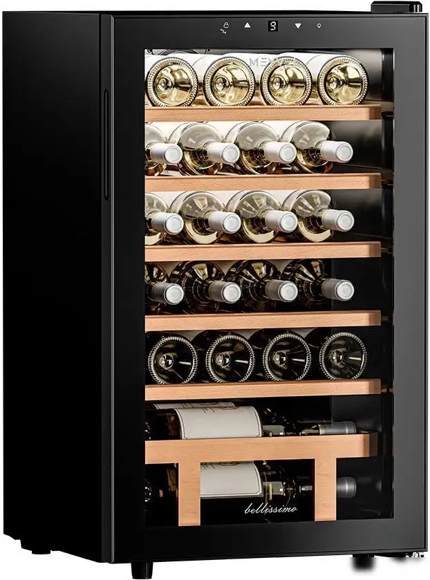 Винный шкаф Meyvel MV24-KBF1 — это стильное и практичное решение для хранения до 24 бутылок. Он оснащён одной температурной зоной, которая регулируется от 5 до 18 градусов Цельсия и поддерживается с помощью компрессорной системы. Управление осуществляется сенсорной панелью, расположенной снаружи, что делает настройку простой и удобной. Металлические полки из дерева обеспечивают аккуратное хранение и защиту вашей коллекции. Стеклянная дверь с двойным стеклопакетом сохраняет температуру и защищает от ультрафиолетовых лучей. Внутри есть индикатор температуры и сигнал о неисправностях, что помогает следить за состоянием шкафа. Уровень шума составляет всего 38 дБ, поэтому он не будет мешать в помещении. Встроенный замок от детей обеспечивает дополнительную безопасность. Размеры устройства позволяют легко разместить его в любой комнате, а вес 21,3 кг делает его довольно мобильным.