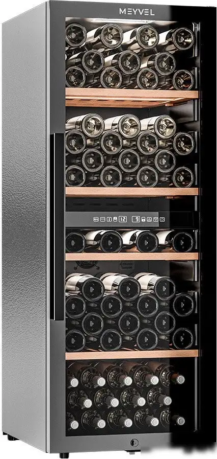 Винный шкаф Meyvel MV98-KBF2 — это отдельностоящее устройство с двумя зонами хранения, позволяющее поддерживать нужную температуру в диапазоне от 5 до 20°C. Он оснащён компрессорным охлаждением, что обеспечивает стабильную температуру и надежную работу. Внутри размещается до 98 бутылок, которые хранятся на пяти полках из дерева, что помогает сохранить вкус и аромат вин. Управление осуществляется сенсорной панелью, расположенной внутри шкафа, а индикация температуры делает контроль удобным. Шкаф обит черным цветом и имеет стеклопакетную дверь, которая защищает ваши вина от света. Благодаря функции регулировки температуры и сигналу о неисправностях, вы всегда держите под контролем условия хранения. Шум устройства составляет всего 36 дБ, а энергоэффективность класса A помогает экономить электроэнергию. Есть заблокировать шкаф для защиты от детей, а антибактериальный фильтр дополнительно сохраняет чистоту. Размеры компактны — ширина 49 см, глубина 57,5 см и высота 127 см, а вес составляет 48,7 кг.
