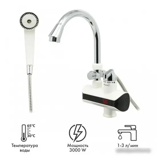 Этот проточный электрический водонагреватель подходит для установки на кухню или столешницу. Он нагревает воду с помощью электросистемы и подключается к одной фазе электропитания. Устройство обеспечивает поток воды от 1 до 3 литров в минуту и позволяет регулировать температуру до 65°C. Простое управление осуществляется через встроенный дисплей, что помогает точно настроить нужную температуру. Водонагреватель оборудован смесителем для удобства использования. Он работает при водяном давлении от 0.5 до 5 бар, что делает его универсальным для большинства систем водоснабжения. В конструкцию входит сухой ТЭН, что увеличивает продолжительность службы. Размеры устройства — 21×12×28 см, а вес всего 1.41 кг, что облегчает монтаж. Этот нагреватель не имеет удаленного управления и термостата безопасности.