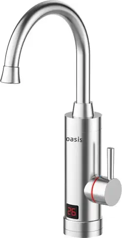 Проточный электрический водонагреватель-кран Oasis KP-S предназначен для установки на мойке или столешнице. Он работает от однофазного электропитания мощностью 3 кВт, быстро нагревает воду и позволяет регулировать и задавать конкретную температуру. Водонагреватель оснащён металлическим смесителем с поворотным изливом, что удобно для использования. Он выполнен в белом цвете или из нержавеющей стали, хорошо сочетается с разными интерьерами. Конструкция включает корпус, уплотнительные прокладки и держатель провода, упрощая монтаж и использование. Максимальное рабочее давление на входе — 6 бар, что обеспечивает безопасность работы. В комплект входит руководство и гарантийный талон. Габариты устройства делают его компактным — шириной 26 см, глубиной 6 см и высотой 43 см, а вес — всего 1,9 кг, что облегчает установку и использование.