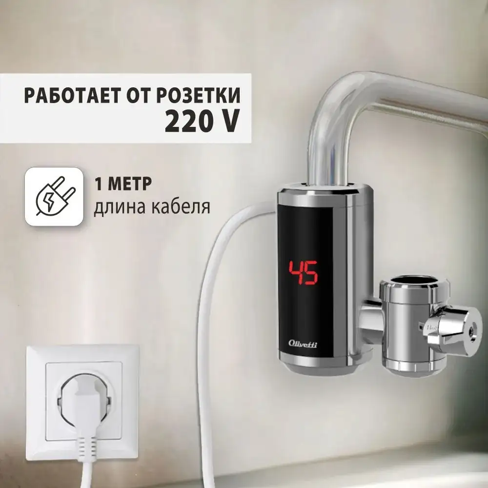 Проточный электрический водонагреватель Olivetti OL-WH4050SS монтируется прямо на кран и позволяет быстро нагреть воду до 60°C. Он работает от однофазного электроснабжения и нагревает воду со скоростью 1 литр в минуту, что подходит для ежедневного пользования. Водонагреватель оснащён дисплеем для контроля температуры и термостатом безопасности, который защищает от перегрева. Устройство рассчитано выдерживать давление до 5 бар, что делает его безопасным и надёжным. В комплекте идут все необходимые переходники, кольца и инструменты для быстрого монтажа. Это устройство удобно в использовании и занимает мало места, идеально подходит для домашнего использования.