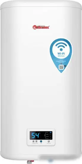 Накопительный электрический водонагреватель Thermex IF 50 V (pro) Wi-Fi предназначен для быстого нагрева воды в домашних условиях. Он имеет объем 50 литров и мощность 2 кВт, что позволяет эффективно и быстро нагревать воду до 75°C. Устройство расположено вертикально и крепится на стену, занимая мало места. Благодаря встроенному Wi-Fi его можно управлять удалённо через смартфон, что удобно и экономит время. Внутри находится бак из нержавеющей стали с антибактериальной защитой, а теплоизоляция помогает сохранять тепло длительное время. Водонагреватель оснащён дисплеем для настройки температуры и термостатом для безопасности. Это делает его простым в использовании и надёжным прибором для дома.