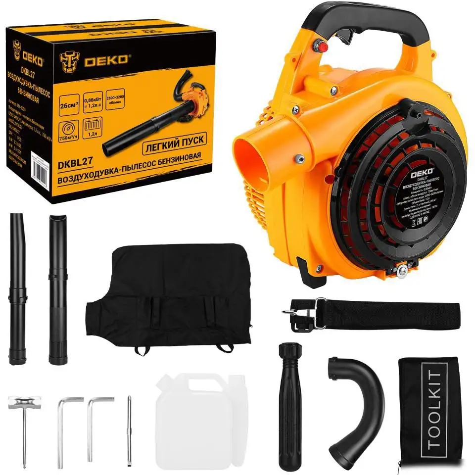 Ручная воздуходувка Deko DKBL27 083-2003 — портативное устройство для сада с бензиновым двухтактным двигателем объёмом 26 см³ и мощностью 880 Вт. Она обеспечивает расход воздуха до 12,5 кубометров в минуту и может работать как пылесос для сбора мусора, есть функция мульчирования 10:1. Вес составляет около 7 кг, есть наплечный ремень и возможность управления одной рукой; в комплект входят трубы, пылесборник, емкость для топлива, пылесосная насадка и мешок для мусора. Гибкая труба не предусмотрена, опорные колеса отсутствуют и анти-вибрационная система не применяется.
