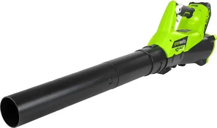 Воздуходувка Greenworks G40AB — электрическая ручная модель без аккумулятора; батарея не входит в комплект. Двигатель электрический, питание осуществляется от аккумулятора Li-ion на 40 В (аккумулятор не прилагается). Расход воздуха в раструбе составляет 7.62 м3/мин, скорость воздуха на выходе — 45 м/с. Вес изделия около 1.9 кг, есть мягкая рукоятка и управление одной рукой; в комплекте круглая насадка.