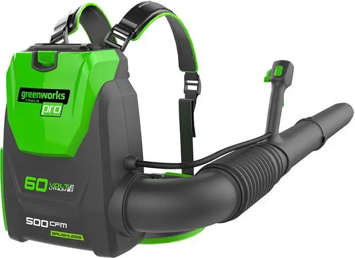 Воздуходувка Greenworks GD60BPB — модель без аккумулятора в комплекте, работающая на 60 В Li-ion системе (батарея не входит). Устройство имеет гибкую трубу, наплечный ремень и мягкую рукоятку, что облегчает работу одной рукой и переноску; в комплект входит круглая насадка. Максимальная скорость выдува достигает 62,5 м/с, расход воздуха 15 м³/мин, уровень шума 80 дБА. Вес без аккумулятора — 3,8 кг.