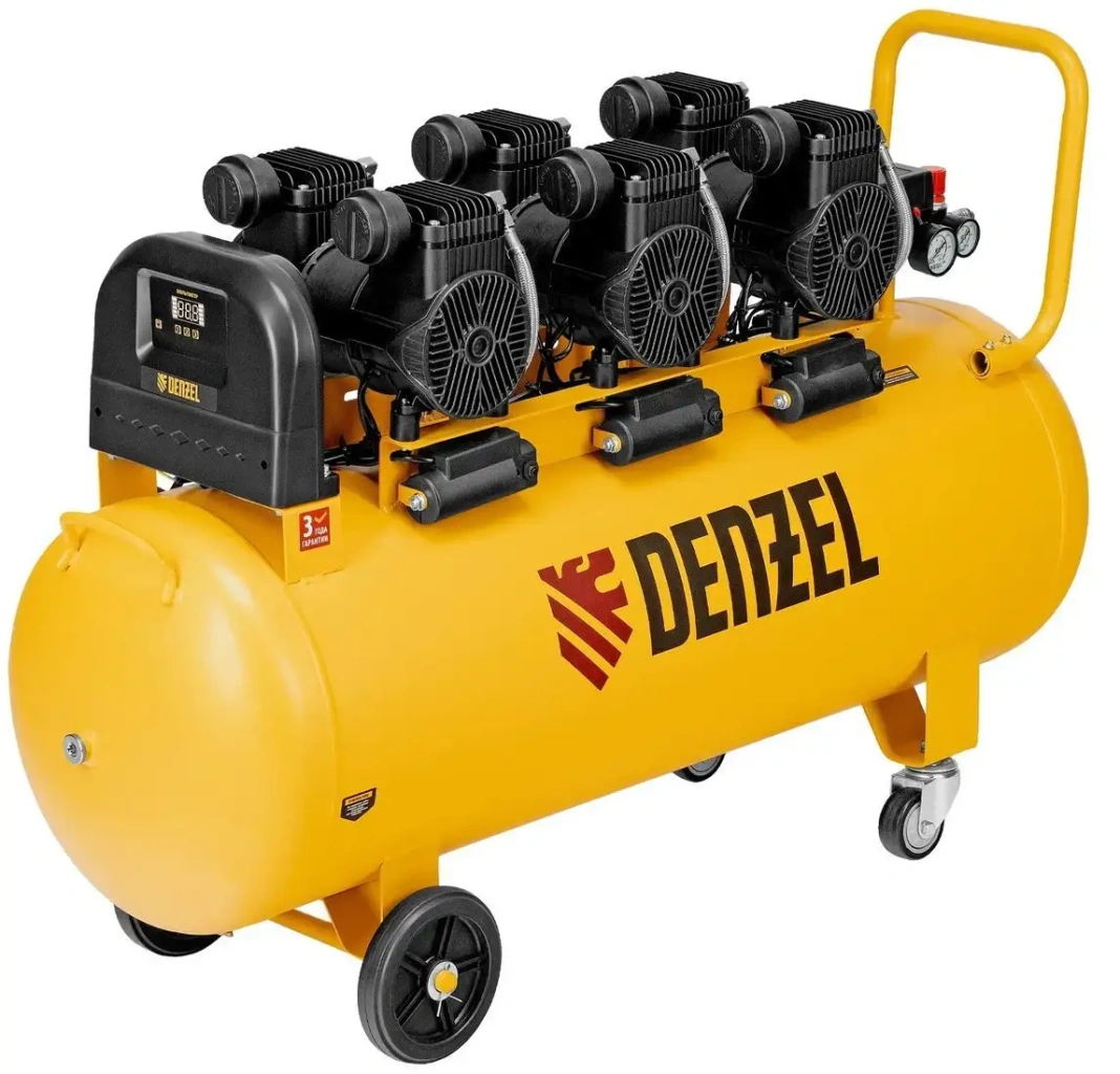 Компрессор Denzel DLP-4500/150 — мощное устройство с поршневым типом двигателя, которое работает без масла и передает привод прямо. Он оснащен шестью цилиндрами, что обеспечивает максимальное давление от 5.5 до 8 атм и производительность до 750 литров в минуту. Такой компрессор идеально подходит для стационарных работ и профессионального использования. Он имеет колесо с крепежом и поворотное колесо, что облегчает его перемещение по территории. Корпус ярко-жёлтого цвета легко заметен в рабочей зоне. Максимальный уровень шума достигает 70 дБ, что обеспечивает комфорт при работе. В комплект входит воздушный фильтр, инструкция и гарантийный талон. Габариты устройства — около 1.3 метра в длину, 42 см в ширину и 75 см в высоту, весит он 96 кг.