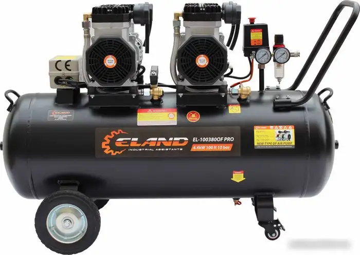 Компрессор ELAND EL-100380OF PRO — это мощный и удобный в использовании инструмент с электродвигателем безмасляного типа и прямым приводом. Он оснащён 4 цилиндрами и способен создавать давление до 8 атм, что делает его подходящим для различных задач. Объём ресивера составляет 100 литров, что позволяет долго работать без перерывов. Мощность компрессора — 4,4 кВт, а его производительность на входе достигает 782 литров в минуту. Компактный и передвижной, он легко перемещается благодаря специальным колесам и весит всего 70 кг. Этот компрессор отлично подойдет для профессионального использования и работы в мастерских.