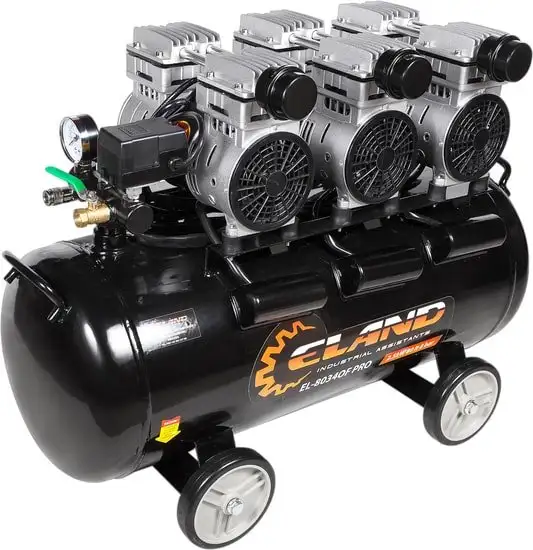 Компрессор ELAND EL-8034OF PRO — это мощный поршневой агрегат с электродвигателем. Он работает без масла, что упрощает его обслуживание и использование. Модель оснащена 80-литровым ресивером и имеет производительность до 400 литров в минуту. Максимальное давление достигает 8 атмосфер, что подходит для различных задач. Компактный и передвижной, он легко транспортируется благодаря колесам и опорной ножке. Уровень шума составляет всего 70 дБ, что делает его более комфортным в использовании. Этот компрессор идеально подойдет для мастерских, строительных работ и домашнего использования.