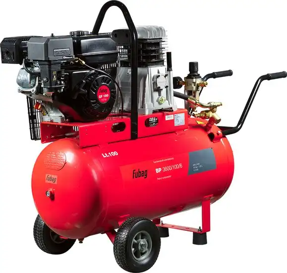 Компрессор Fubag BP 3600/100/6 — это мощное устройство с бензиновым двигателем и ручным запуском, которое легко переносить благодаря колесам. Он оснащён 100-литровым ресивером, что обеспечивает стабильную работу и чистый воздух. Модель работает на масляной смазке, что продлевает срок службы компрессора. Мощность агрегата составляет 4,4 кВт, а производительность на входе — 360 л/мин, что подходит для различных строительных и ремонтных работ. Максимальное давление достигает 10 атмосфер, что позволяет использовать оборудование для высокого давления. В конструкции есть один цилиндр и одна ступень мощности, что облегчает обслуживание. Компрессор имеет компактные размеры: длина 1240 мм, ширина 520 мм, высота 1110 мм. Вес устройства — около 103 кг, благодаря чему оно надёжно стоит на месте во время работы. Это устройство подходит для интенсивных профессиональных задач и домашних проектов, где важна высокая производительность и долговечность.