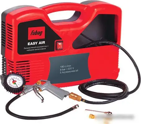 Компрессор Fubag Easy Air мощностью 180 л/мин отлично подходит для дома и ремонта. Он работает на электродвигателе безмасляной системы, что упрощает его использование. Компактные размеры и вес всего 6.5 кг делают его легко переносимым. Он не имеет ресивера, что позволяет быстро начать работу и легко хранить устройство. Максимальное давление 8 атм обеспечивает достаточную силу для надувания шин, матрасов и других предметов. Благодаря передвижной конструкции, компрессор легко переносится и используется в разных местах. Он работает при входном напряжении 220 В, что удобно для домашней электросети. Модель обладает высоким КПД и надежностью. Простая в использовании и легкая в обслуживании, эта модель подходит для различных задач.