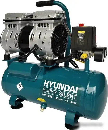 Компрессор Hyundai HYC 1406S — это портативное устройство с двухцилиндровым поршневым двигателем, работающим от электросети 220 В. Он имеет прямой привод и безмасляную конструкцию, что облегчает обслуживание и обеспечивает чистую работу. Ресивер объемом 6 литров позволяет накапливать воздух для использования в различных задачах. Мощность компрессора составляет 0.7 кВт, а его производительность — 140 литров в минуту, что делает его подходящим для домашних и небольших профессиональных работ. Максимальное давление достигает 8 атм, а уровень шума — всего 59 дБ, что делает его тихим и комфортным в эксплуатации. Компрессор легкий — всего 14 кг — и удобный в перемещении, хотя передвижной дизайн не предусмотрен. Он выполнен в зеленом или синем цвете, что позволяет выбрать подходящий для вас вариант.