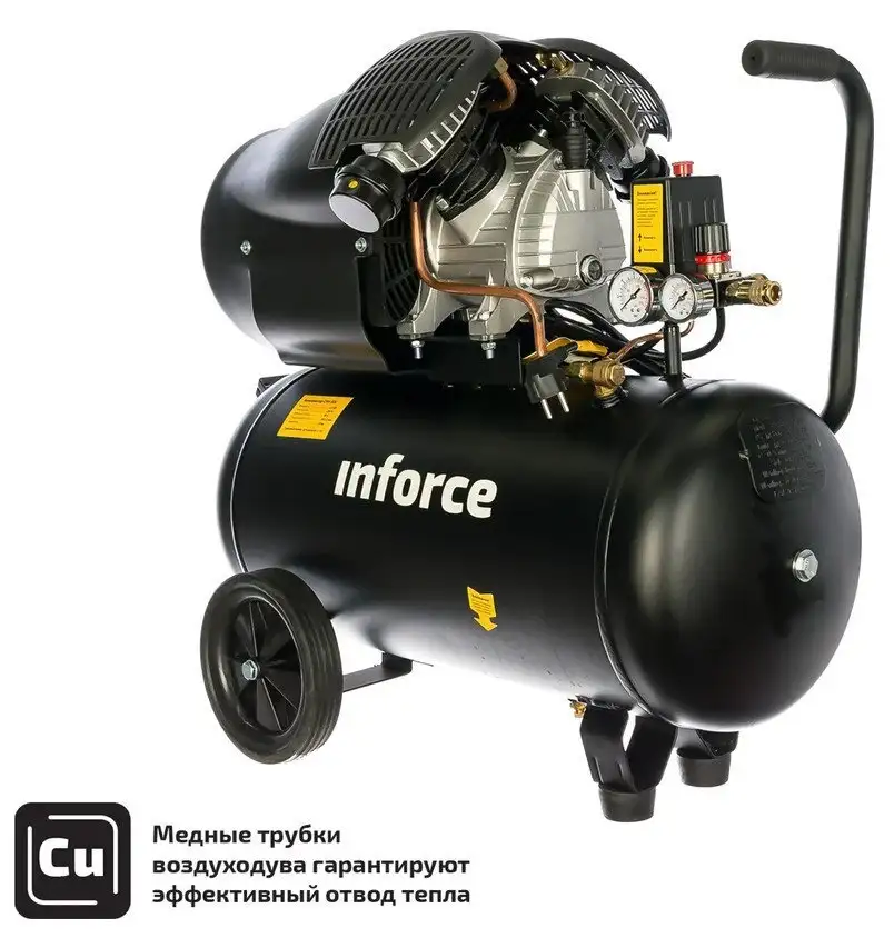 Компрессор Inforce CXV-50L — это мощное устройство с поршневым двигателем и масляным смазкой, которое обеспечивает эффективную работу. Он оснащён 2.2 кВт мотором и производит до 300 литров воздуха в минуту при максимальном давлении 10 атм. В компрессоре есть 50-литровый ресивер, который позволяет аккумулировать воздух и поддерживать стабильную работу. Прямой привод обеспечивает надёжность и простоту обслуживания. Устройство не имеет осушителя, что подходит для использования в условиях, где влажность не критична. Передвижная конструкция с ручками облегчает транспортировку по рабочему месту. Он работает тихо — уровень шума составляет 85 дБ, что делает его комфортным для использования рядом с людьми. В комплект входит сам компрессор и упаковка для хранения и транспортировки. Этот компрессор отлично подходит для автосервисов, стройки и домашних задач, где требуются сильный поток сжатого воздуха.