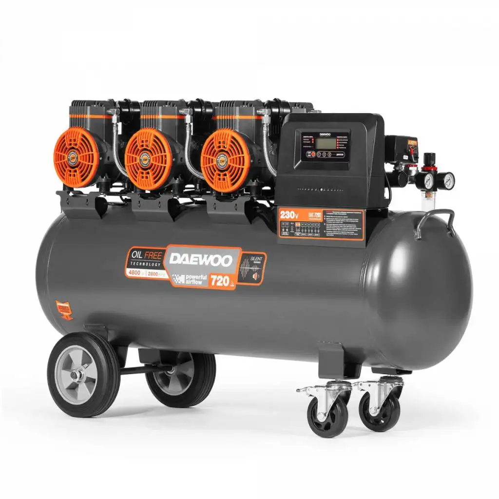 Компрессор Daewoo Power DAC 720S — это мощное и надежное устройство для работы с воздухом. Он имеет электродвигатель мощностью 4,8 кВт и обеспечивает производительность до 720 литров воздуха в минуту. Этот поршневой компрессор безмасляный, что облегчает его обслуживание и повышает долговечность. Он оснащен ресивером объемом 100 литров и может создавать давление до 8 атмосфер, что подходит для разных задач. В конструкции есть передвижные колеса и резиновые опоры, что позволяет легко переносить прибор. Уровень шума всего 68 дБ делает работу с этим компрессором комфортной и не очень громкой.
