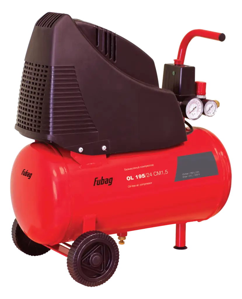 Компрессор Fubag OL 195/24 CM1,5 — это переносной поршневой компрессор безмасляного типа. Он работает на мощной мощности 1,1 кВт и способен производить до 180 литров сжатого воздуха в минуту, что подходит для домашних и небольших профессиональных задач. В компрессоре есть 24-литровый ресивер, который помогает стабильно поддерживать давление. Максимальное давление достигает 8 атмосфер, что позволяет выполнять различные виды работы, требующие высокого давления. Привод у модели коаксиальный, она легко перемещается благодаря своим размерам и весу — 19 кг. Компрессор работает от 220 В, что делает его универсальным для использования в разных условиях. Он компактный, его длина — 600 мм, ширина — 260 мм, а высота — 580 мм, что удобно для хранения и перемещения.