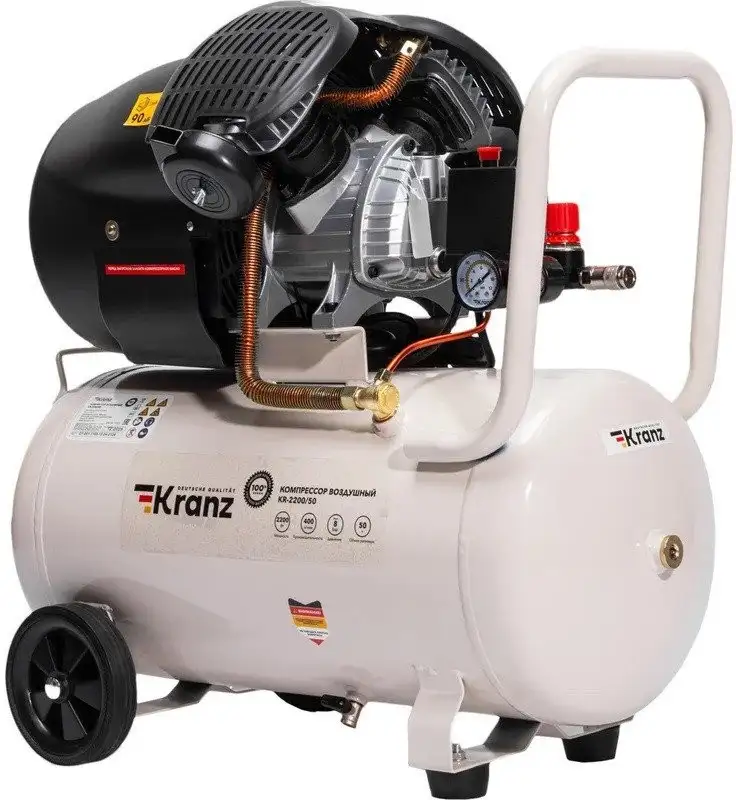 Компрессор Kranz KR-2200/50 — это мощное устройство с поршневым типом двигателя, который работает на электропитании 230 В. Он оснащен масляным смазкой для долгой и надежной работы и имеет привод прямо на двигатель. Компрессор оснащен 50-литровым ресивером, что позволяет сохранять запас воздуха для различных задач. Он обеспечивает производительность 300 литров в минуту на выходе и 400 литров на входе, что подходит для различных профессиональных и бытовых нужд. Устройство имеет две цилиндровые ступени и уровень шума 90 дБ, что делает его достаточно тихим для своей мощности. Передвижные колеса и виброопоры облегчают транспортировку и стабильность при работе. В комплект входят шланг длиной 5 метров, фильтры, сапун, пистолет для продувки, компрессорное масло и руководство по эксплуатации. Этот компрессор весит 36,5 кг и легко перемещается благодаря колесам.