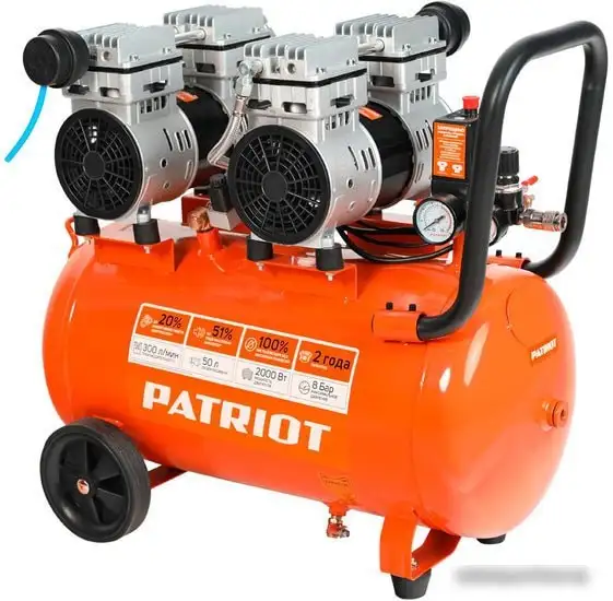 Компрессор Patriot WO 50-300 — это портативное устройство с поршневым типом двигателя, которое работает на электроснабжении 220 В. Он имеет непрерывную работу без масла, что упрощает его обслуживание. В компрессоре установлен 50-литровый ресивер, который позволяет сохранять запас сжатого воздуха и использовать его длительное время. Максимальное давление достигает 8 атмосфер, а его мощность составляет 2 кВт, что обеспечивает производительность 300 литров в минуту. Этот компрессор легко перемещать, так как он передвижной и весит всего 36 кг. Уровень шума составляет 54 дБ, что делает его довольно тихим для такой мощности.