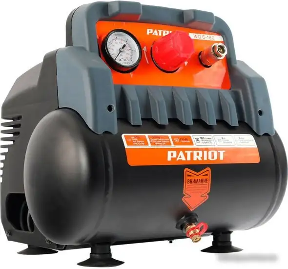 Компрессор Patriot WO 6-180 — это компактный и лёгкий поршневой агрегат с электродвигателем мощностью 1.1 кВт. Он работает без масла, что делает его более простым в использовании и уходе. Устройство имеет прямой привод и ресивер объёмом 6 литров, что позволяет быстро нагнетать воздух до максимального давления 8 атм. Максимальная производительность составляет 180 литров в минуту, а уровень шума — всего 54 дБ, что обеспечивает комфортную работу. Этот компрессор легко перемещать благодаря передвижной конструкции и яркому оранжево-чёрному дизайну. Он идеально подходит для бытовых задач и небольших ремонтных работ.