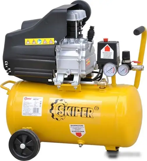 Компрессор Skiper AR25A — это небольшой и лёгкий прибор, который работает на электрическом моторе с мощностью 1,5 кВт. Он использует поршневую технологию и имеет прямой привод, что делает его надёжным и простым в использовании. Объём ресивера составляет 25 литров, он позволяет накапливать воздух и использовать его для различных задач, а его цвет — яркий жёлтый, что легко заметно. Максимальное давление, которое он создаёт, — 8 атмосфер, а производительность на входе — 220 литров в минуту. Этот компрессор не имеет осушителя, но при этом довольно компактный с весом всего 18,3 кг, он легко переносится и подходит для работы в гараже или мастерской. Также он работает достаточно тихо для подобного вида оборудования, уровень шума — 92 дБ.