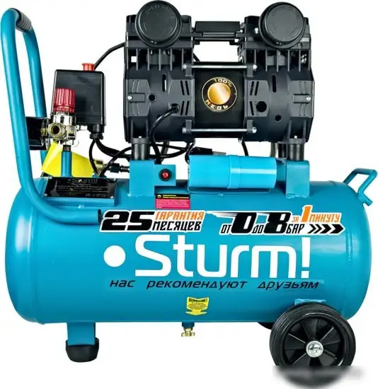 Компрессор Sturm AC93250OL — это портативный поршневой устройство с электродвигателем, выполненное в бирюзовом цвете. Он работает безмасляно, что облегчает уход и обеспечивает чистоту воздуха. Модель имеет прямой привод, что делает работу надежной и долговечной. С ресивером объемом 50 литров компрессор подходит для различных задач, например, для накачки шин или использования в мастерской. Мощность составляет 1,5 кВт, а производительность — 240 литров в минуту, что позволяет быстро выполнять работу. Максимальное давление составляет 8 атм, а два цилиндра обеспечивают стабильную работу. Передвижная конструкция с колесами облегчает перенос устройства. В комплект входит воздушный фильтр и колесные опоры, что делает использование более удобным и безопасным. Вес компрессора — 22 кг, он легко транспортируется и занимает минимум места при хранении. Такой компрессор станет надежным помощником в домашней мастерской и гараже.