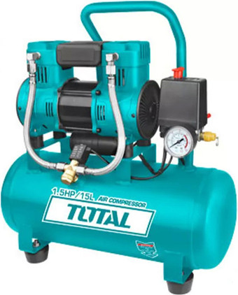 Компрессор Total TCS1110152 — это мощное устройство с электродвигателем мощностью 1.1 кВт, которое обеспечивает стабильное давление до 8 атм для различных задач. Он работает безмасляно, что избавляет от необходимости обслуживания и обеспечивает более чистую работу. Прямой привод позволяет снизить уровень шума до 67 дБ и повысить надежность устройства. В комплект входит резервуар объемом 15 литров и опоры для устойчивой установки. Такой компрессор подходит для домашних ремонтов, покрасочных работ и автосервисов. Он легко перемещается благодаря компактному дизайну и хорошо справляется с длительными нагрузками. Простое управление делает его удобным для любого пользователя. Надежность и простота в эксплуатации делают этот компрессор отличным выбором для повседневных задач.