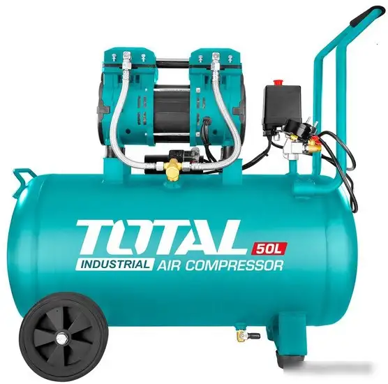 Компрессор Total TCS1120508 работает на электродвигателе мощностью 1.2 кВт и не требует масла, что облегчает его обслуживание. Он оснащён ресивером объёмом 50 литров для стабильной подачи воздуха. Производительность составляет 220 литров в минуту, что обеспечивает быструю работу. Устройство легко переносить благодаря двум транспортировочным колесам и передвижной конструкции. Максимальное давление достигает 8 атмосфер, что подходит для большинства домашних и профессиональных задач. Уровень шума равен 75 дБ, что делает работу менее шумной. Он подключается к сети с напряжением 230 В и не имеет встроенного осушителя, поэтому воздух не очищается от влаги. Комплектация включает сам компрессор, колёса, инструкцию и коробку для хранения. Этот компрессор подходит для тех, кому важна мобильность и простота использования.