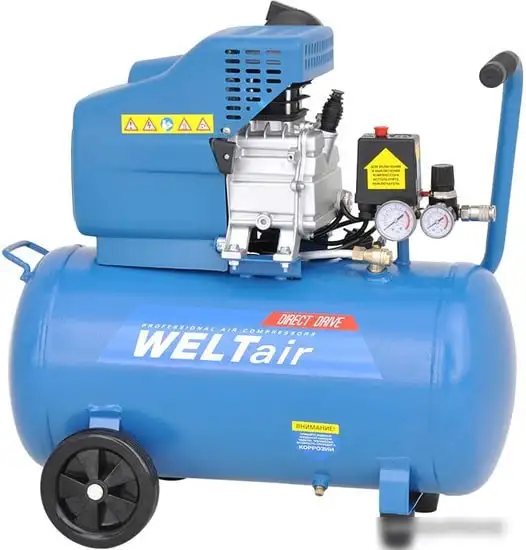 Компрессор Welt AR50LT — это портативное устройство с поршневым типом двигателя, работающим на масле. Он оснащён электродвигателем мощностью 1,8 кВт, который обеспечивает производительность до 260 литров в минуту. Благодаря прямому приводу и ресиверу ёмкостью 50 литров, компрессор быстро создает необходимое давление до 8 атм. Он не имеет встроенного осушителя, что подходит для простых задач, требующих сжатого воздуха. Цвет модели — синий, а вес составляет 26 кг, что облегчает перемещение. Передвигать его помогают колёса, делая использование удобным. Уровень шума — 93 дБ, поэтому при работе потребуется соблюдать меры безопасности. Компрессор подключается к сети с напряжением 220 В, что устраняет сложность в использовании. Он подходит для автосервиса, малого производства и домашних работ.