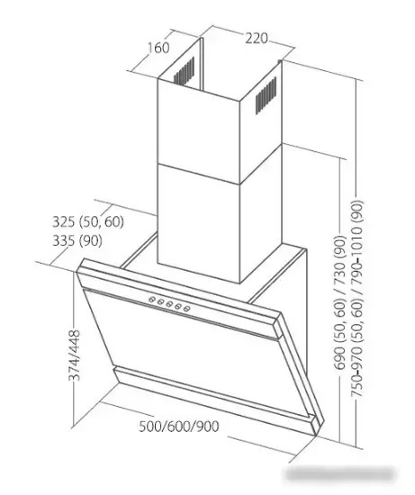 конструкция наклонная, монтаж настенный, ширина 50 см, управление механическое/кнопочное, производительность мотора 800 м3/ч, цвет белый/нержавеющая сталь