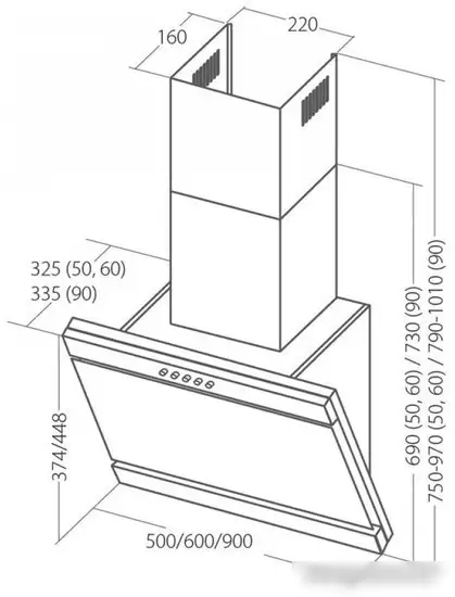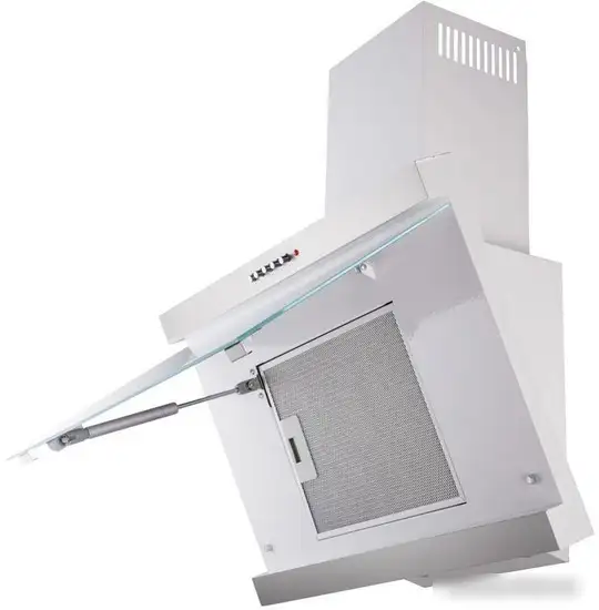 конструкция наклонная, монтаж настенный, ширина 60 см, управление механическое/кнопочное, производительность мотора 850 м×/ч, цвет белый/нержавеющая сталь