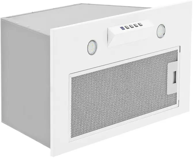 конструкция скрытая, монтаж для встраивания, ширина 53 см, управление электронное/кнопочное, производительность мотора 1250 м×/ч, цвет белый