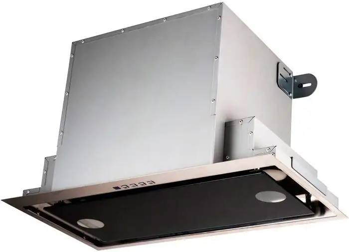 конструкция скрытая, монтаж для встраивания, ширина 53 см, управление кнопочное, производительность мотора 1100 м×/ч, цвет нержавеющая сталь/черный