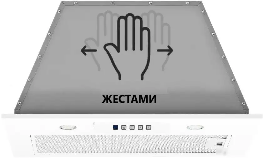 конструкция скрытая, монтаж для встраивания, ширина 53 см, управление электронное/кнопочное/жестами/дистанционное, производительность мотора 1250 м×/ч, цвет белый
