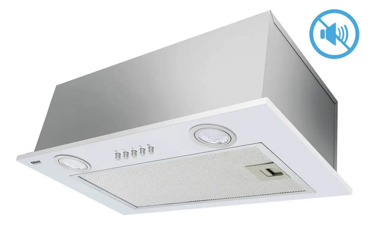конструкция скрытая, монтаж для встраивания, ширина 52 см, управление механическое/кнопочное, производительность мотора 800 м×/ч, цвет белый