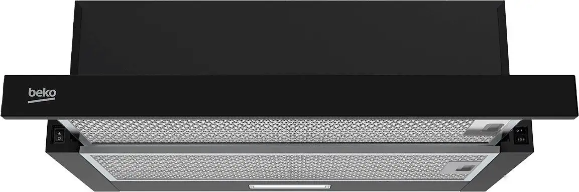 конструкция телескопическая, монтаж для встраивания, ширина 59.8 см, управление механическое/кнопочное, производительность мотора 320 м×/ч, цвет черный