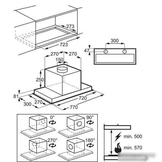 конструкция скрытая, монтаж настенный/для встраивания, ширина 77 см, управление электронное/кнопочное, производительность вытяжки 580 м×/ч, цвет черный
