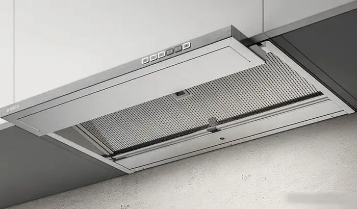 конструкция телескопическая, монтаж для встраивания, ширина 59.4 см, управление электронное/кнопочное, производительность вытяжки 700 м×/ч, цвет нержавеющая сталь
