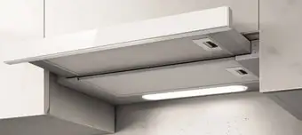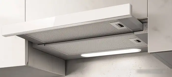 конструкция телескопическая, монтаж для встраивания, ширина 59.8 см, управление механическое/кнопочное, производительность вытяжки 336 м3/ч, производительность мотора 650 м3/ч, цвет белый/серый