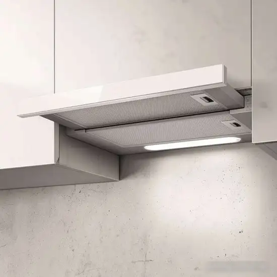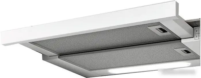 конструкция телескопическая, монтаж для встраивания, ширина 89.8 см, управление механическое/кнопочное, производительность вытяжки 650 м×/ч, цвет белый