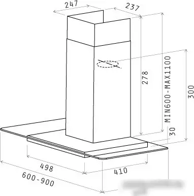 конструкция Т-образная, монтаж настенный, ширина 90 см, управление электронное/кнопочное, производительность вытяжки 400 м3/ч, производительность мотора 700 м3/ч, цвет нержавеющая сталь
