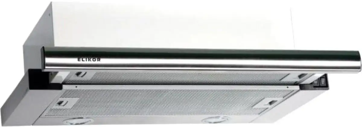 конструкция телескопическая, монтаж для встраивания, ширина 60 см, управление механическое/кнопочное, производительность мотора 700 м×/ч, цвет нержавеющая сталь