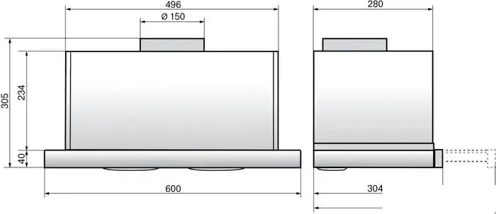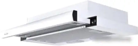 конструкция телескопическая, монтаж для встраивания, ширина 60 см, управление механическое/кнопочное, производительность мотора 700 м3/ч, цвет белый