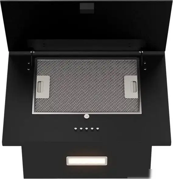 конструкция наклонная, монтаж настенный, ширина 49 см, управление механическое/кнопочное, производительность мотора 430 м×/ч, цвет черный